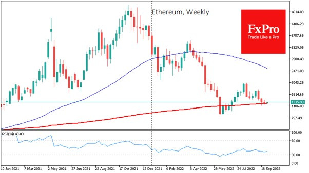 Ethereum is lying at its 200-week moving average for the third week. Perhaps the entire crypto market lacks an important external driver to switch to growth, although no meaningful decline exists.
