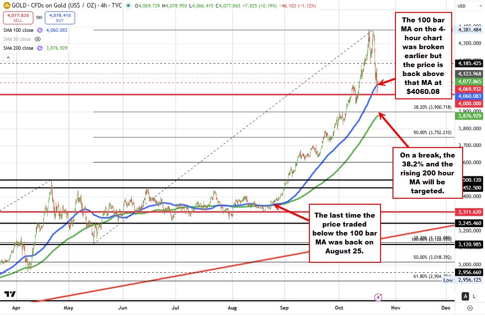 A more negative technical view would happen if the price move back below the 4000 is the level hundred bar moving average on the 4 hour chart at $4060 and then below the $4000 level. The next key target area would be around the $3900 level where the 38.2% retracement of the move up from the May low is found. The rising 200 bar moving average on the 4 hour chart is moving toward that level as well (currently at $3877.