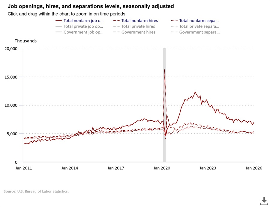 Other separations: The decline to 3.5 million suggests little structural shift in retirements or other exits, reinforcing the view that most of the labor market adjustment is occurring through fewer hires and fewer voluntary quits rather than mass layoffs.