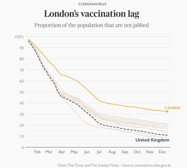 The UK as a whole sees roughly 11% yet to receive a single dose (according to government data) but when it comes to London itself, that figure is nearly tripled at 32%. Here's a breakdown in comparison to other areas: