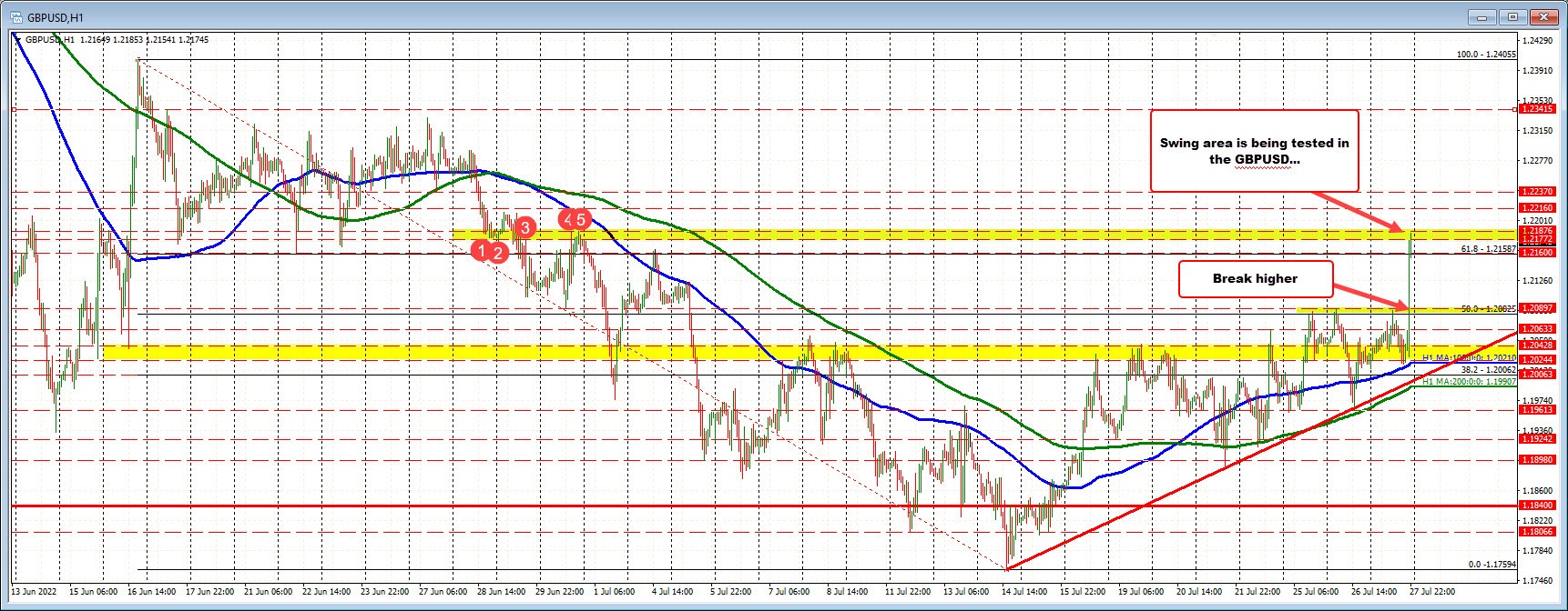The GBPUSD has moved above the 50% retracement of the move down from the June high 1.2082, above 1.2100, above the 61.8% retracement at 1.21587 (of the same move down from the June high). The high has reached 1.21853