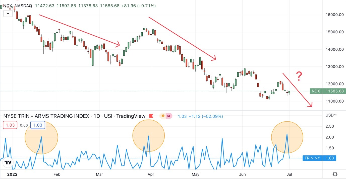 After the TRIN spiked the NASDAQ continued to decline until the TRIN Index trended below 0.60 and stayed below 1.0 for a period. Thus, there is a general three-step trend to observe: