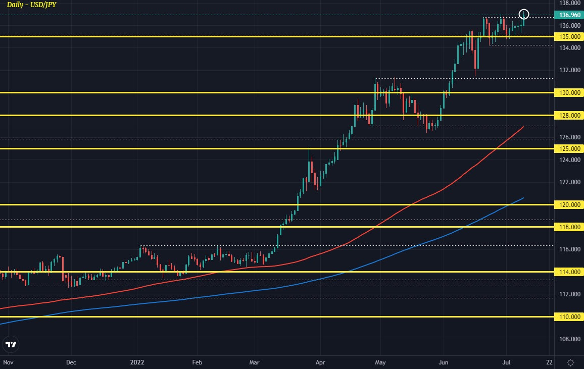 For the past few weeks, buyers have struggled to really clear a break above the 135.00 mark with the highs capped around the region of 136.70 to 137.00. The latest attempt today may also fall short but buyers are at least continuing to keep more poised and knocking on the door of a push higher in the pair.