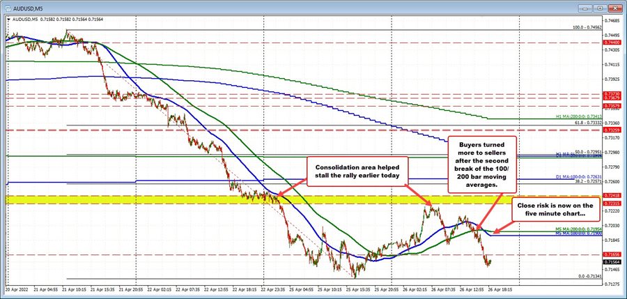Drilling to the five minute chart below, yesterday into the close, the AUDUSD price started to move back above its 100/200 bar moving averages for the first time since the afternoon of April 21.