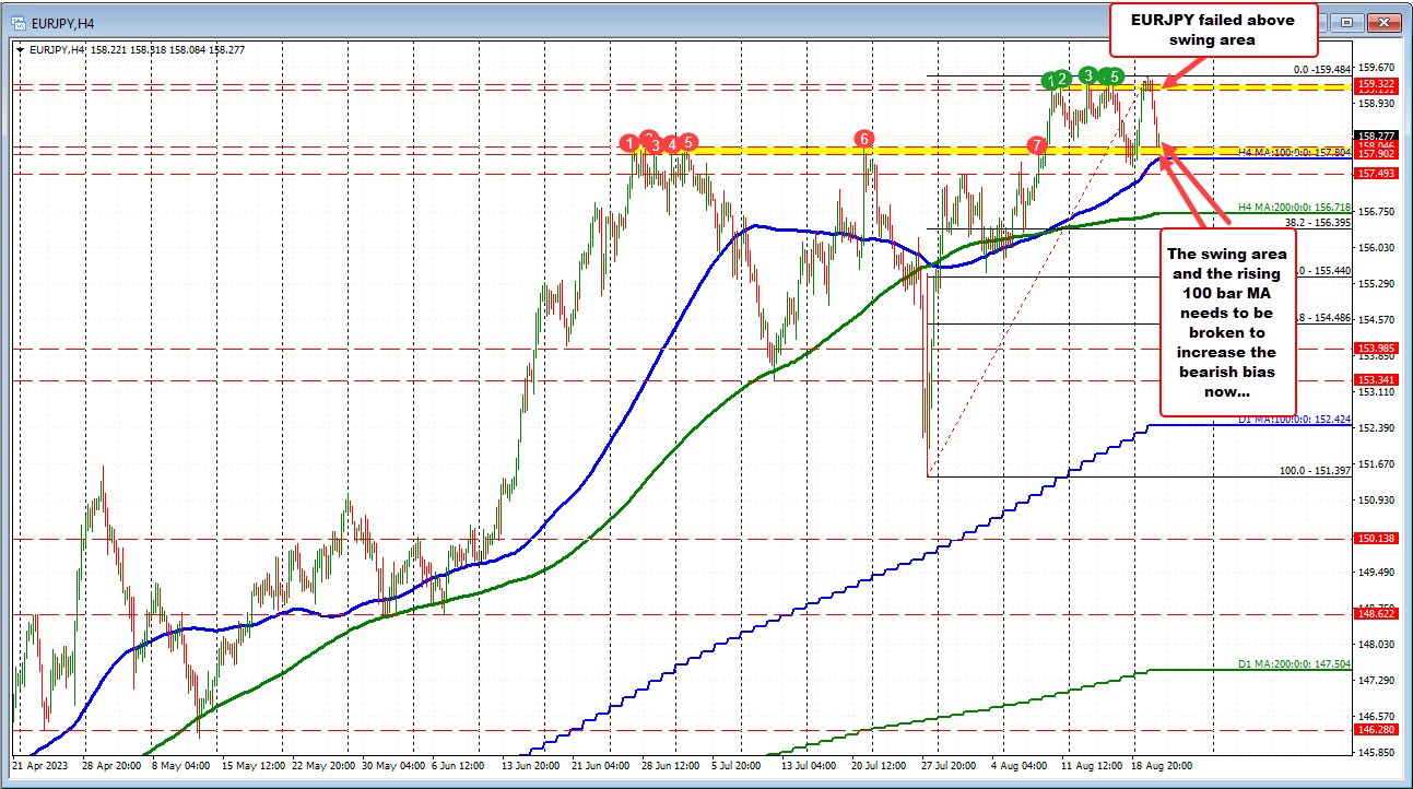 In the US session the price has continued its move to new session lows where the pair's price is testing a lower swing area between 157.90 and 158.046. Also in play is the rising 100 bar moving average on the 4 hour chart (see blue line in the chart below). The low price has reached 159.09 (just above the high of that area) and is bouncing modestly (see red numbered circles on the chart below).