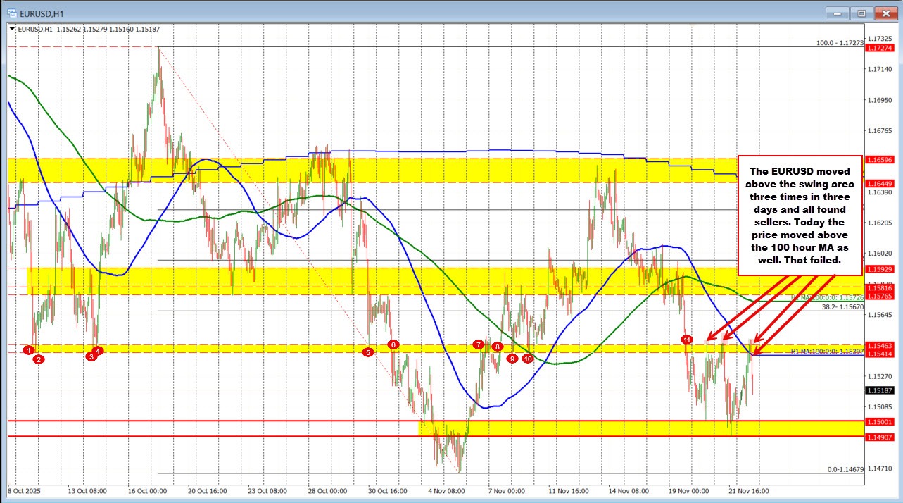 The EURUSD is moving lower after a failed break above the 100-hour MA at 1.15397 and the swing area between 1.1541 and 1.1546. Buyers couldn’t hold the move, shifting the bias back to the downside as failed breaks often do.