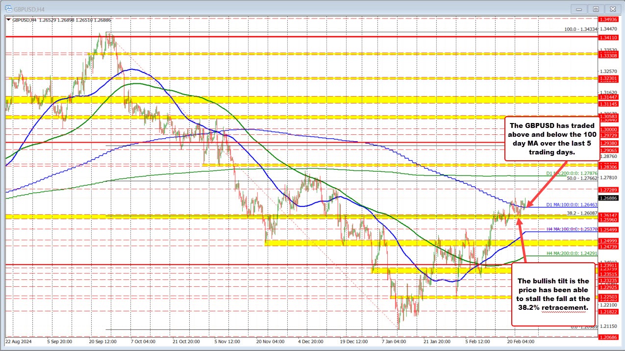 The GBPUSD moved above the 100 day MA for the first time since November 2024 on Thursday of last week. The last 5 trading days has seen the price trade above and below that MA suggestive of a market that is not sure of the next "shove" (higher or lower).