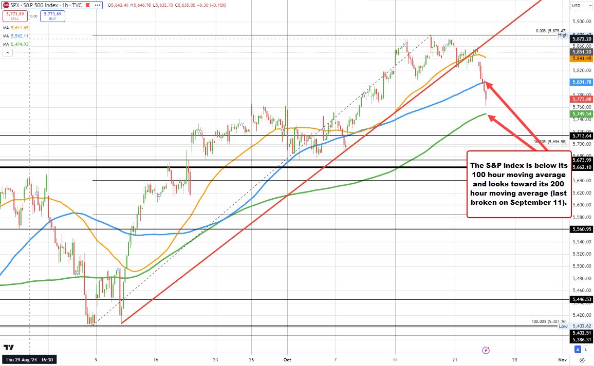 The S&P index has also moved below its 100-hour moving average of 5801.77. Its 200-hour moving average is the next downside target at 5749.54. Earlier today the price gap below its 50 hour moving average which was a bearish tilt. Yesterday I posted a detailed look at the S&P titled "If stocks are so expensive, find a reason to sell". You can read that post HERE.