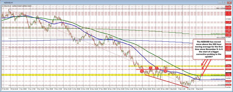 The NZDUSD moved above the 200 hour MA for the first time since November 9, 2021 today at 0.67969. That MA is now risk for longs looking for more upside. The price has just moved to a session high at 0.6818. The NZD is a currency whose central bank has started to tighten and will likely continue to tighten to slow growth/inflation. The 0.68374 is the next target with 0.6855 to 0.68611 after that.as a target.