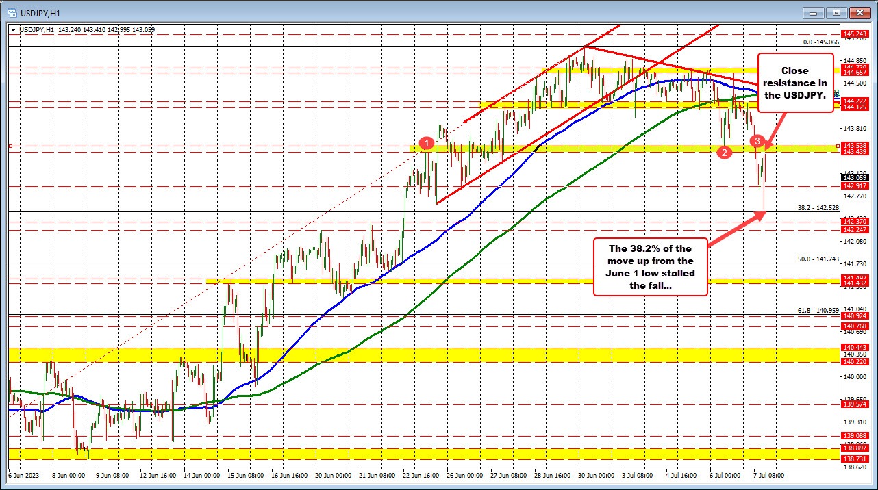 USDJPY: The USDJPY moved lower to test 38.2% of the move up from the June 1 low at 142.528 (see chart below). The price bounced off that level and has seen the pair run back to a break level from earlier today. The 143.43 to 143.53 is the upside target for that pair that if broken, would negate some of the bearish bias on the break lower today. Support buyers were waiting at 38.2% retracement on the dip today.