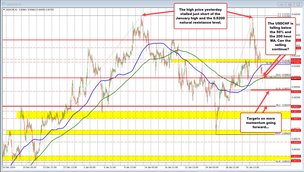 The USDCHF climbed yesterday as weekend tariff news fueled US dollar buying. However, the rally stalled just four pips shy of the January high and key resistance at 0.9200, where buyers turned to sellers. A 30-day tariff reprieve for Mexico, followed by a similar move for Canada, sent the pair lower toward the 100-hour moving average (blue line in the chart below). Buyers leaned and bounced into the European session.