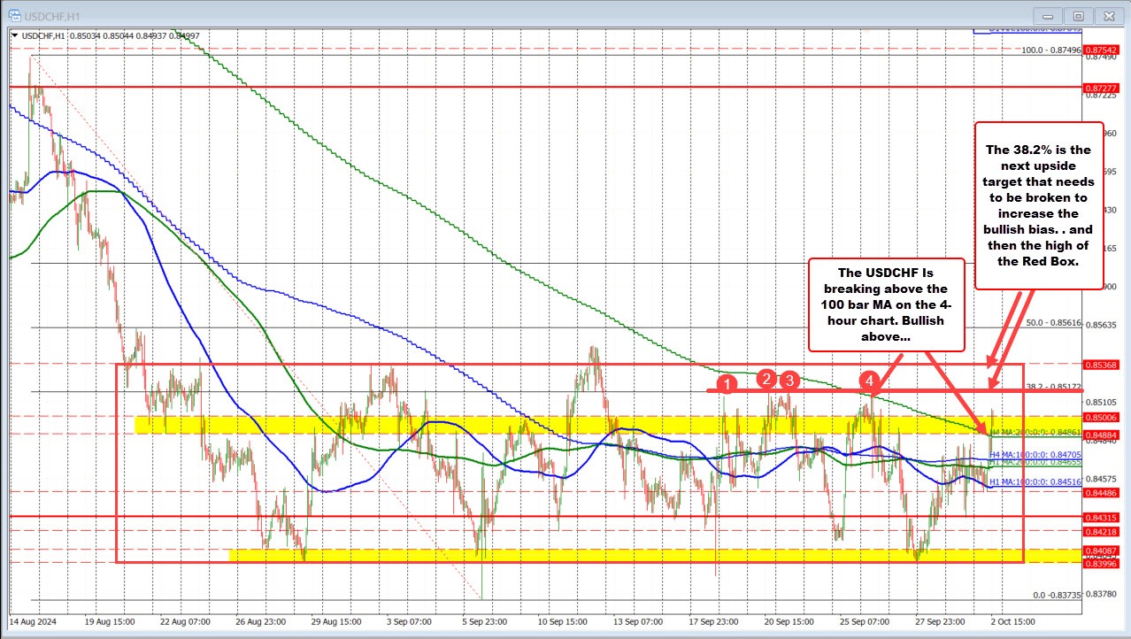 The USDCHF has broken to the upside today at 18 price moved above its 100 bar moving average on the 4-hour chart had 0.8486. Recall from last week the high price for the week stalled right near that moving average and found willing sellers. Breaking above today is a technical shift to the upside. It also sets the moving average at 0.8486 as a close support level. Staying above is more bullish.