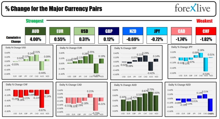 In the forex, the AUD is the reverse of the majors while the CHF is the weakest. The USD is moving back to the upside after a dip lower faded.