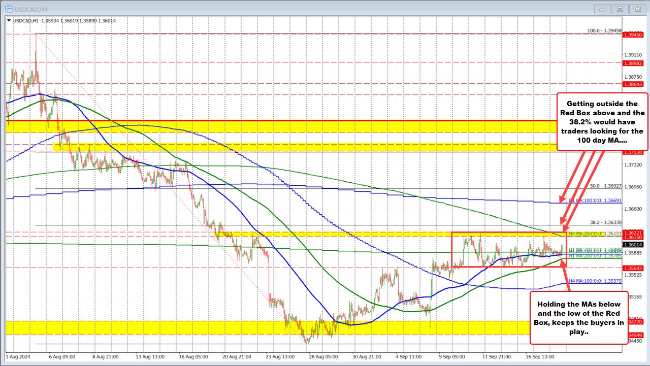 On a move lower, falling below the 200-hour moving average at 1.3679 in the low over the last seven days near 1.3564, would open a door for a move toward the 100-bar moving average on a 4-hour chart at 1.35377. A move below that, and the bias is more in favor the sellers once again.