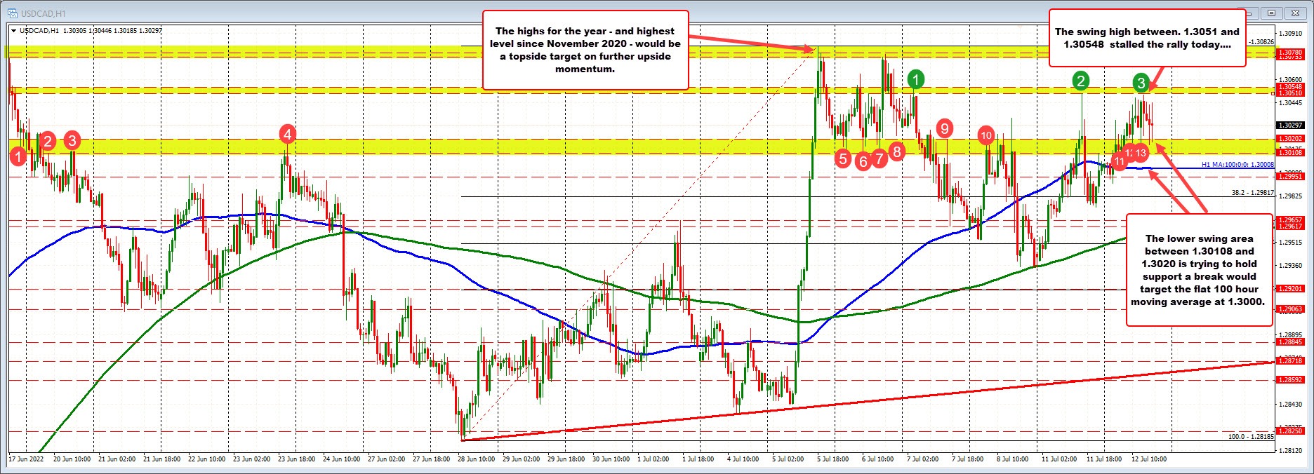 The USDCAD has moved higher today helped by lower oil prices. Crude oil is getting hammered ahead of the Biden/Saudi Arabia meeting on Friday. The crude oil futures are trading at $97.11. That's down near $7 on the day. The low price has reached $96.67. The July 6 low reached $95.10.