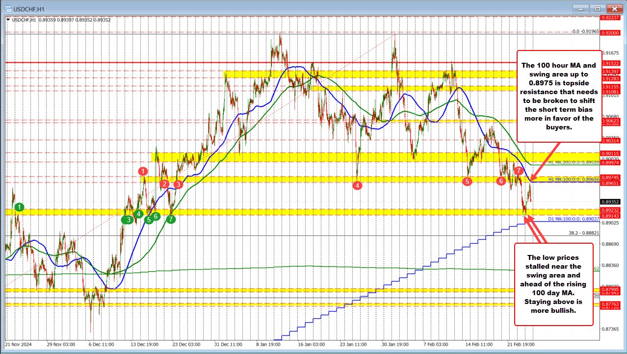 That bounce has seen the price move back toward its 100-hour moving average (blue line in the chart below) where sellers leaned this time and has) back in the middle of swing area support below between 0.8914 and 0.8923, and resistance above against the 100-hour moving average and a swing area between 0.8965 and 0.8975.