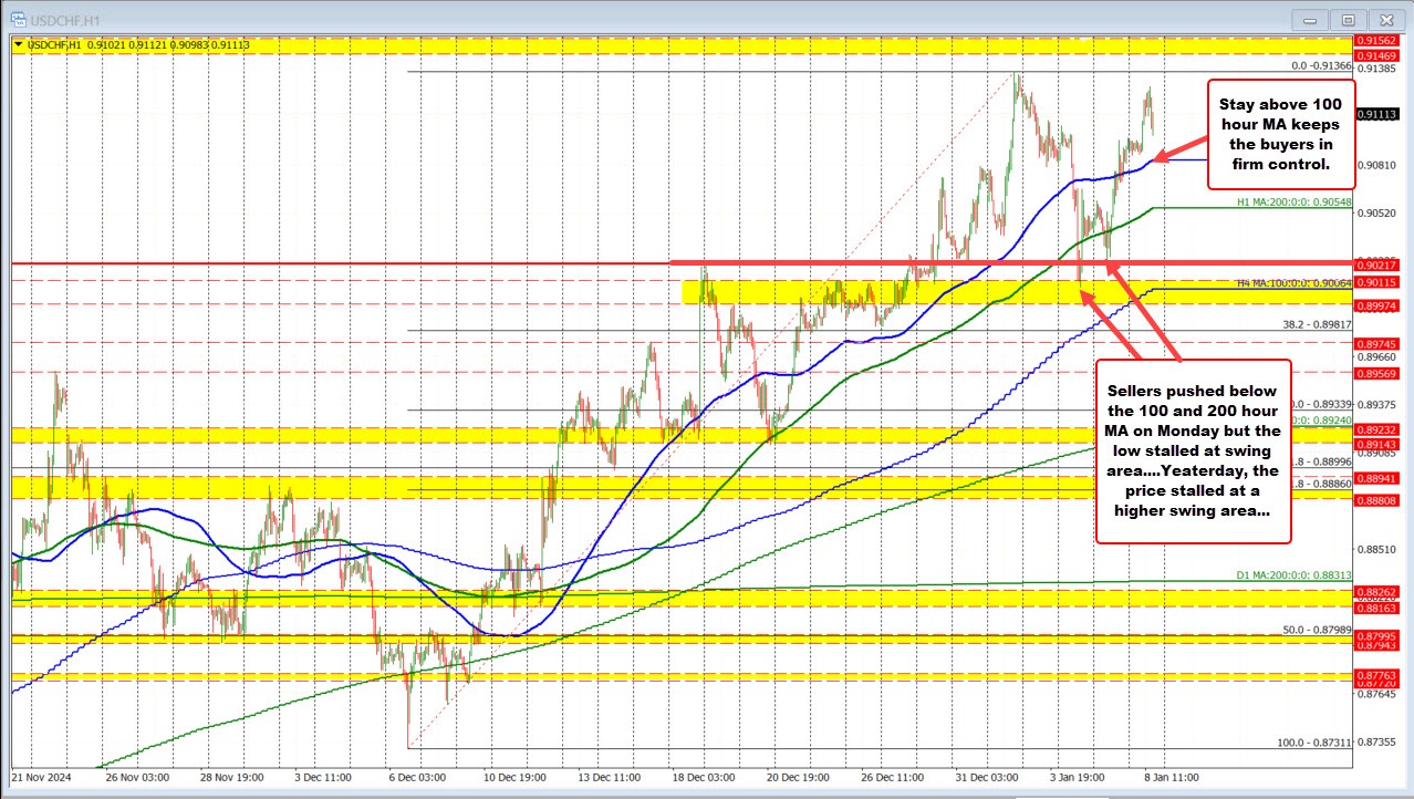 The USD/CHF is trading higher today, driven by a stronger USD, as the pair moves decisively above its 100-hour moving average (MA) at 0.90834. If the price remains above this level, buyers maintain firm control. A break below the 100-hour MA and the 200-hour MA at 0.90548 would shift the bias back to the downside.